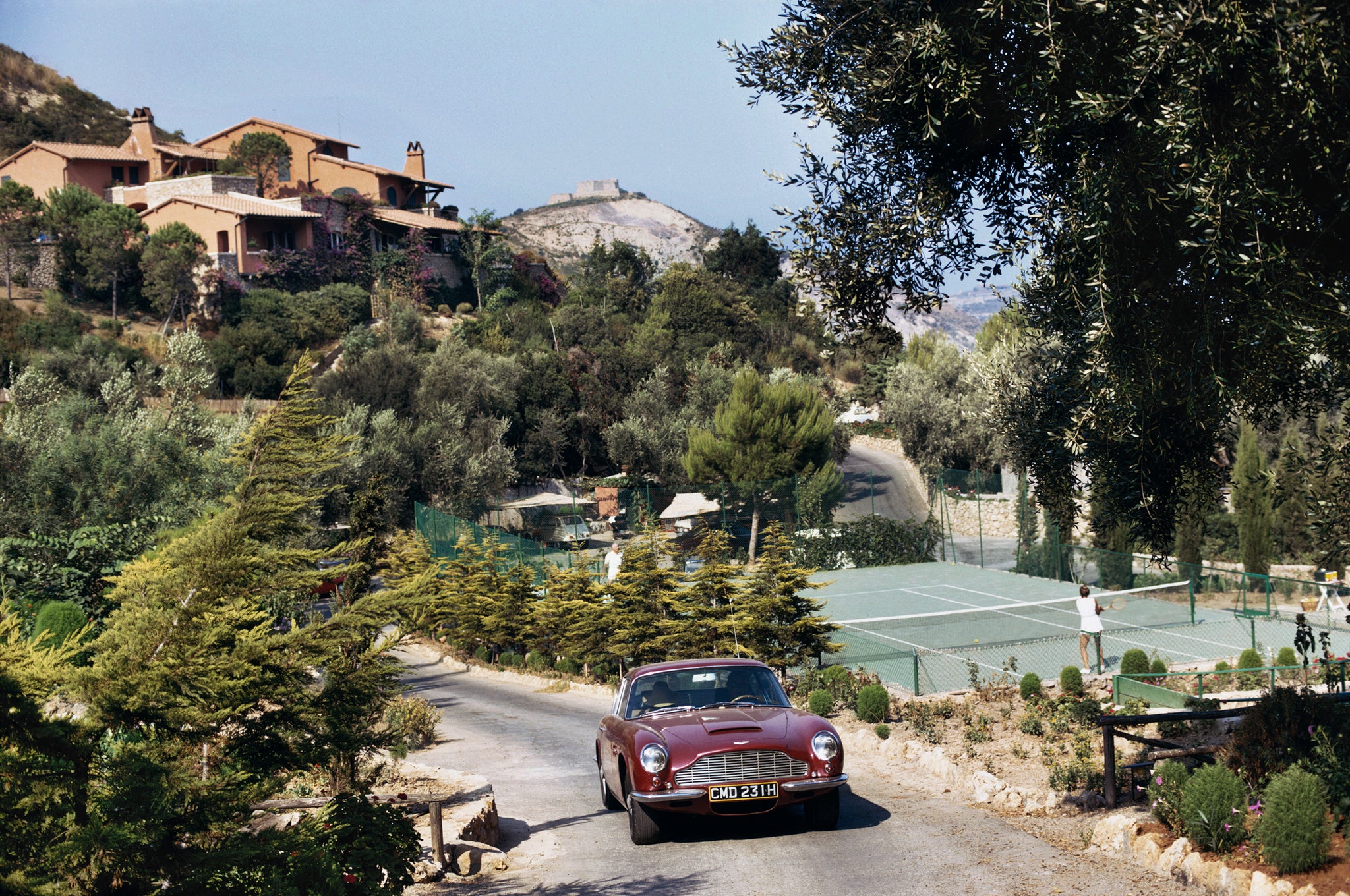 An Aston Martin DB6 sports car driving past the tennis courts at Il Pellicano Hotel in Porto Ercole, Tuscany, August 1973. (Photo by Slim Aarons/Hulton Archive/Getty Images)