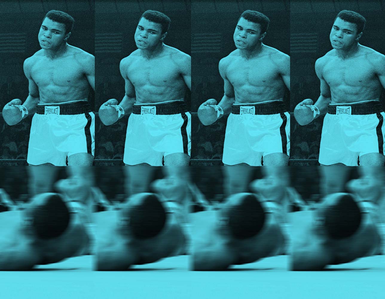 This piece is a modern reworking of the world famous shot of boxer Muhammad Ali standing over Sonny Liston, after knocking him downduring the first round of their match, 25th May 1965.Ali won the fight and retained his title as heavyweight champion.